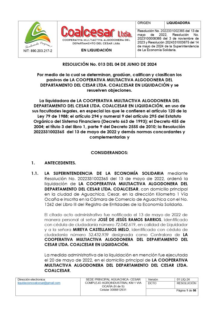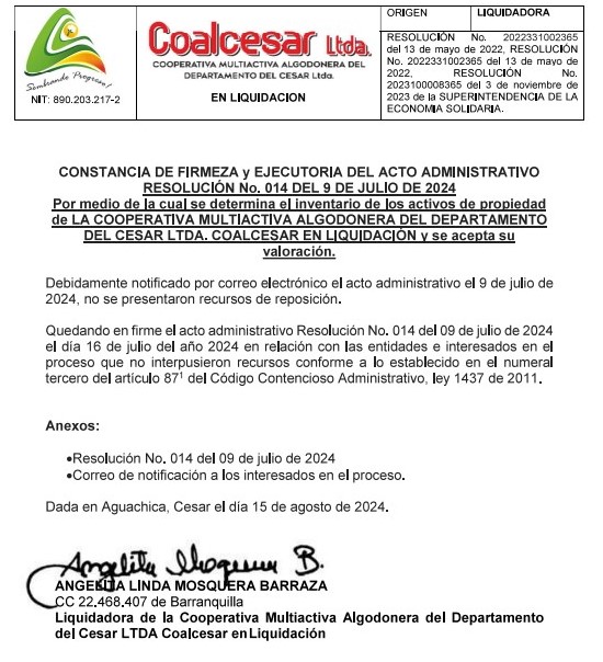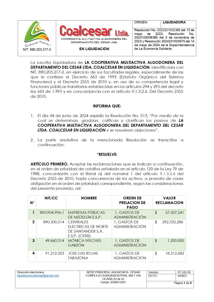 Con ello, la gestión para recuperarla comenzó su enrutamiento: lo primero fue el inventario actuarial de la Empresa y el proceso de sensibilización con los socios para motivarlos a ponerse al día con sus aportes sociales para mantenerse activos y poder así tomar decisiones sobre la reactivación, y, también, renegociar los arriendos de bienes inmuebles que la Cooperativa tiene en Aguachica. Siguió la relación de acuerdos con acreedores y deudores, más el relacionamiento con las autoridades públicas y civiles de los diferentes entes territoriales en el que se desenvuelve el objeto social de la Empresa.