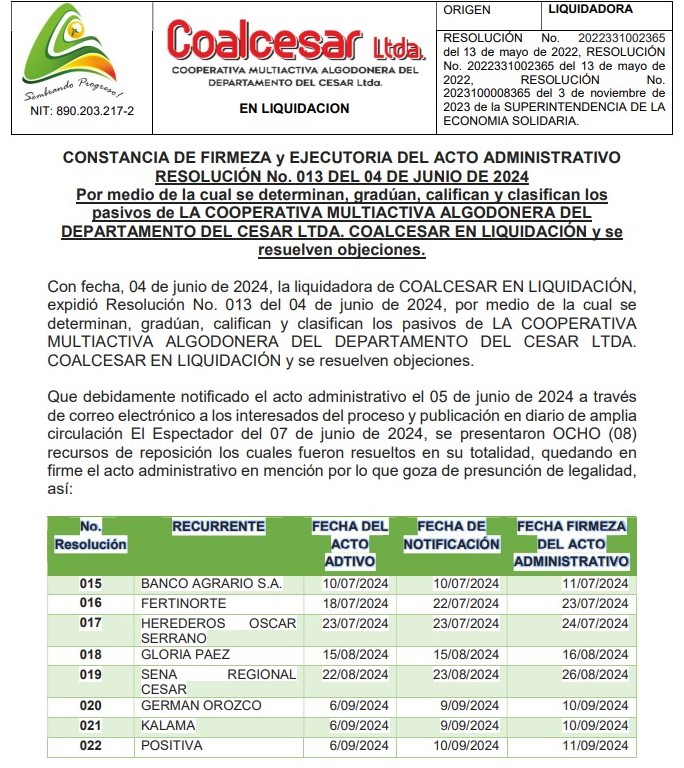 Ante este panorama, encerrados en un tejido escabroso, sin futuro cierto, la Superintendencia de Economía Solidaria tomó posesión de la Empresa desde el 29 de diciembre del 2017 y ordenó su liquidación forzosa administrativa el 13 de mayo del 2022, con medidas de salvamento que aun, hoy, no se resuelven, a pesar que la agencia interventora ha aliviado el compromiso de las deudas y ofertado acciones para nuevos asociados.