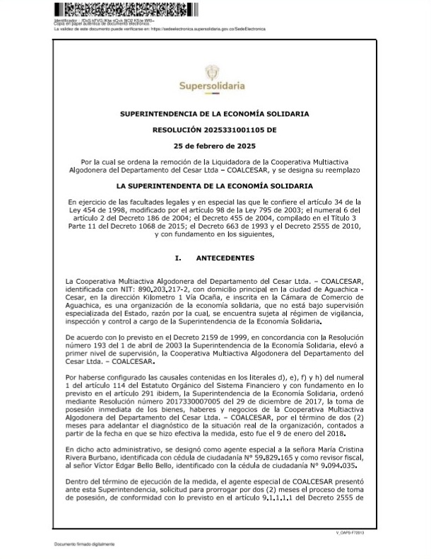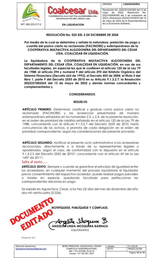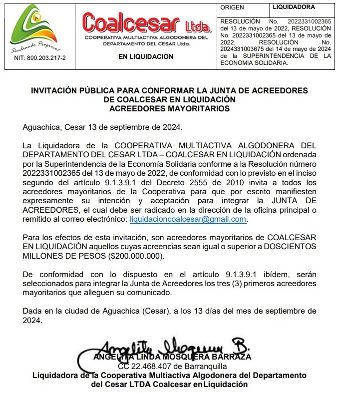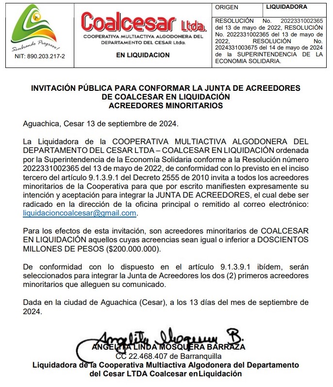La Cooperativa Multiactiva del Cesar, con el apoyo del Gobierno del Cambio, podría recuperarse. En sus mejores tiempos fue una agroindustria que llegó a tener casi mil empleados y a cultivar unas 20 mil hectáreas de algodón, maíz, arroz y soya, en ciclos distintos. Con el TLC y la apertura económica comenzó su declive. Luz de esperanza en convenio SuperSolidaria, Alcaldía de Aguachica, MINCIT, iNNpulsa, ADR y Cámara de Comercio.